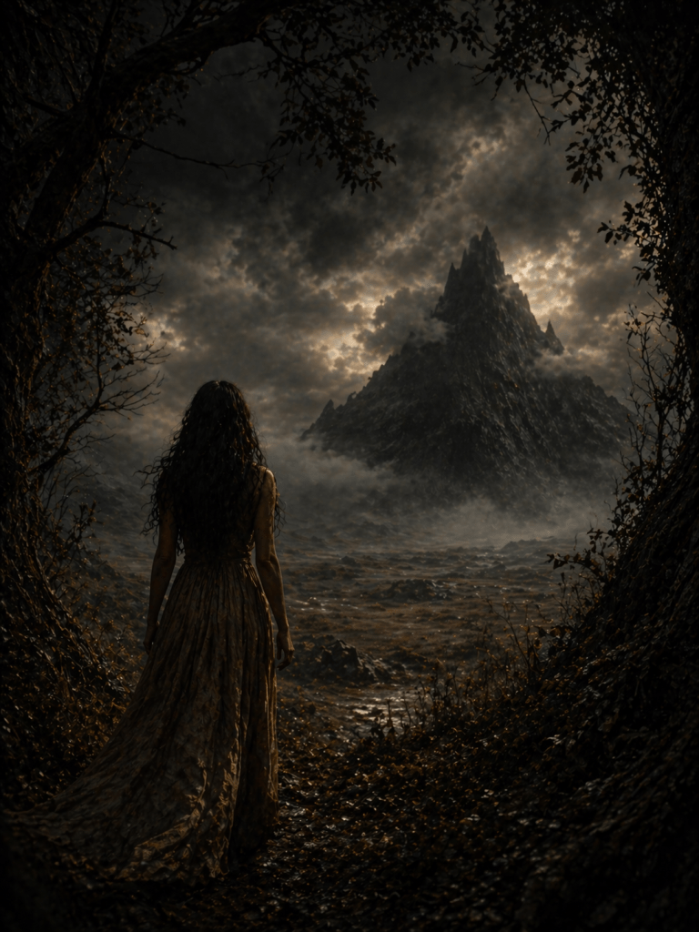 The forest did not hinder her. The path shifted beneath her feet, opening where she stepped. When she emerged from the woods, she stood beyond the village’s reach and turned toward the lone mountain to begin her final climb.