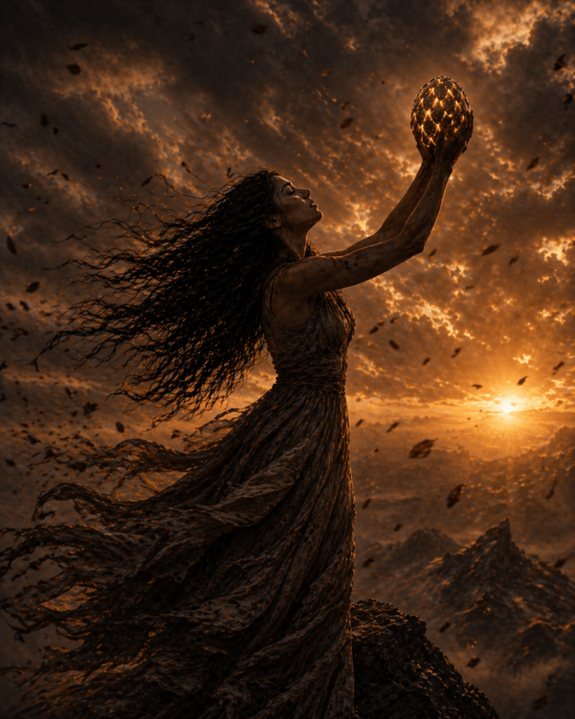 The change came slowly. Warmth rose within her as gold crept across her skin, dull at first, then brightening as its light grew. It moved through her like the veins of a leaf. Her feet rooted into the mountain stone, and her body was no longer her own. Her arms stretched toward the sky as her fingers unfurled into delicate petals that shimmered softly in the wind.