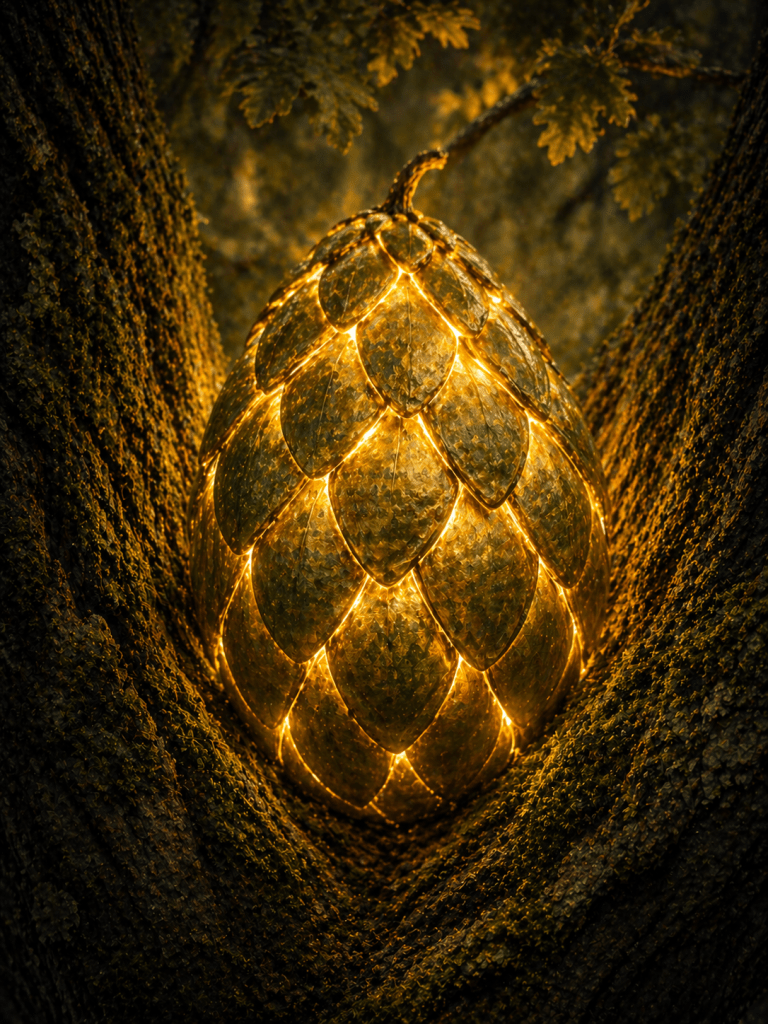 Resting in the crook of the oak was a fruit unlike any she had ever known. It was large–too large to fit easily in her hands–and shaped in a rounded, uneven form, as though grown in layers rather than whole. Its surface was made of overlapping segments, like scales or thick petals pressed tightly together. They curved outward just enough that each could be taken in a single bite. Their color shifted between deep green and deep gold. From within, a faint light pulsed through the seams.