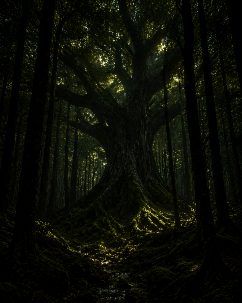 She slowed as the trees rose higher around her, their crowns lost above. Ahead, a single oak tree towered over them all–vast and ancient. The other trees stood at a distance, as though unwilling to press closer. Only a faint light reached the ground there, slipping through in uneven patches and shifting as if stirred by a wind she could not feel.