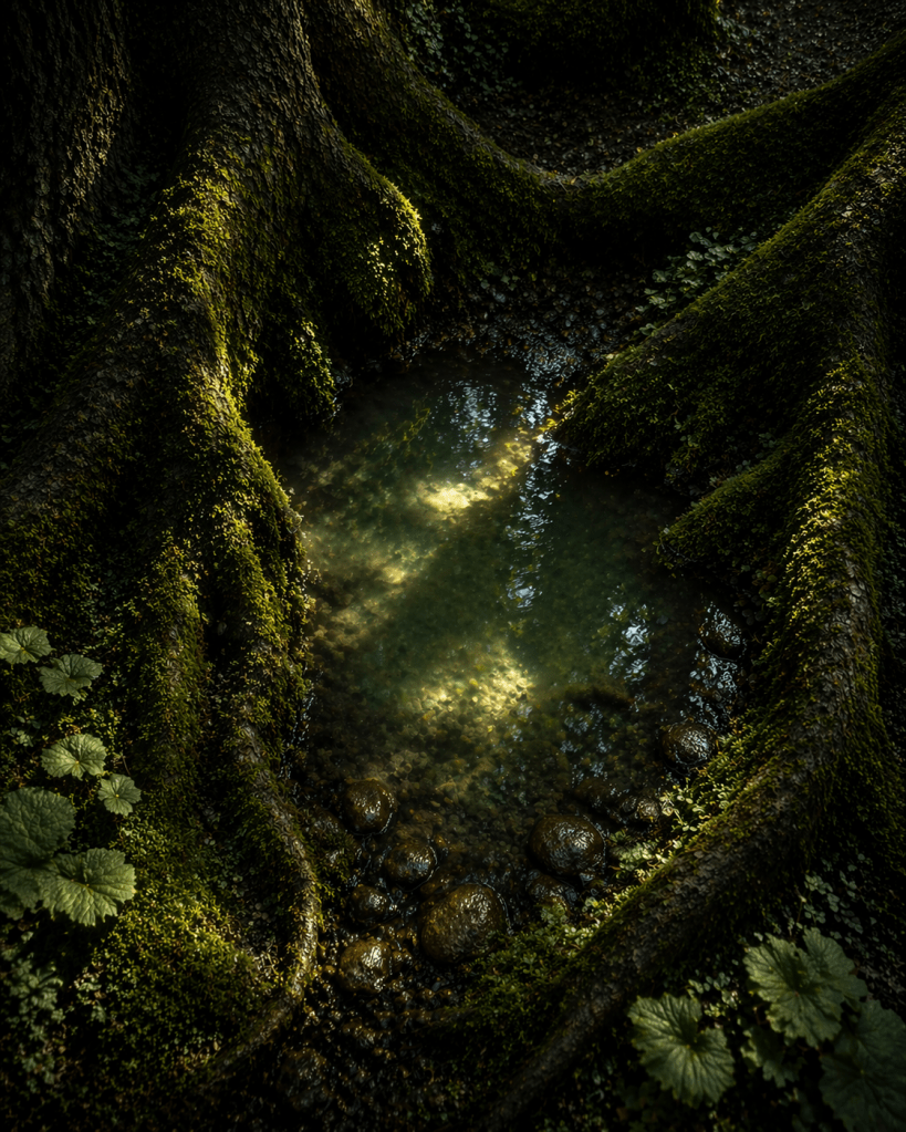 At the base of the oak, where the soil had been dry, a patch of water now lay between two great roots. Its surface was clear like glass, holding the faint green light.